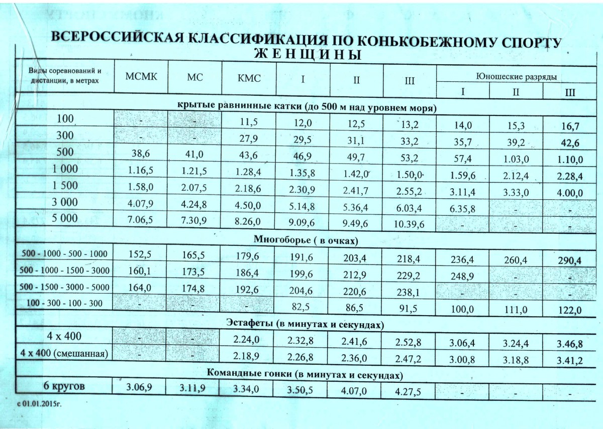 Классификация присвоения разрядов по конькобежному спорту женщины