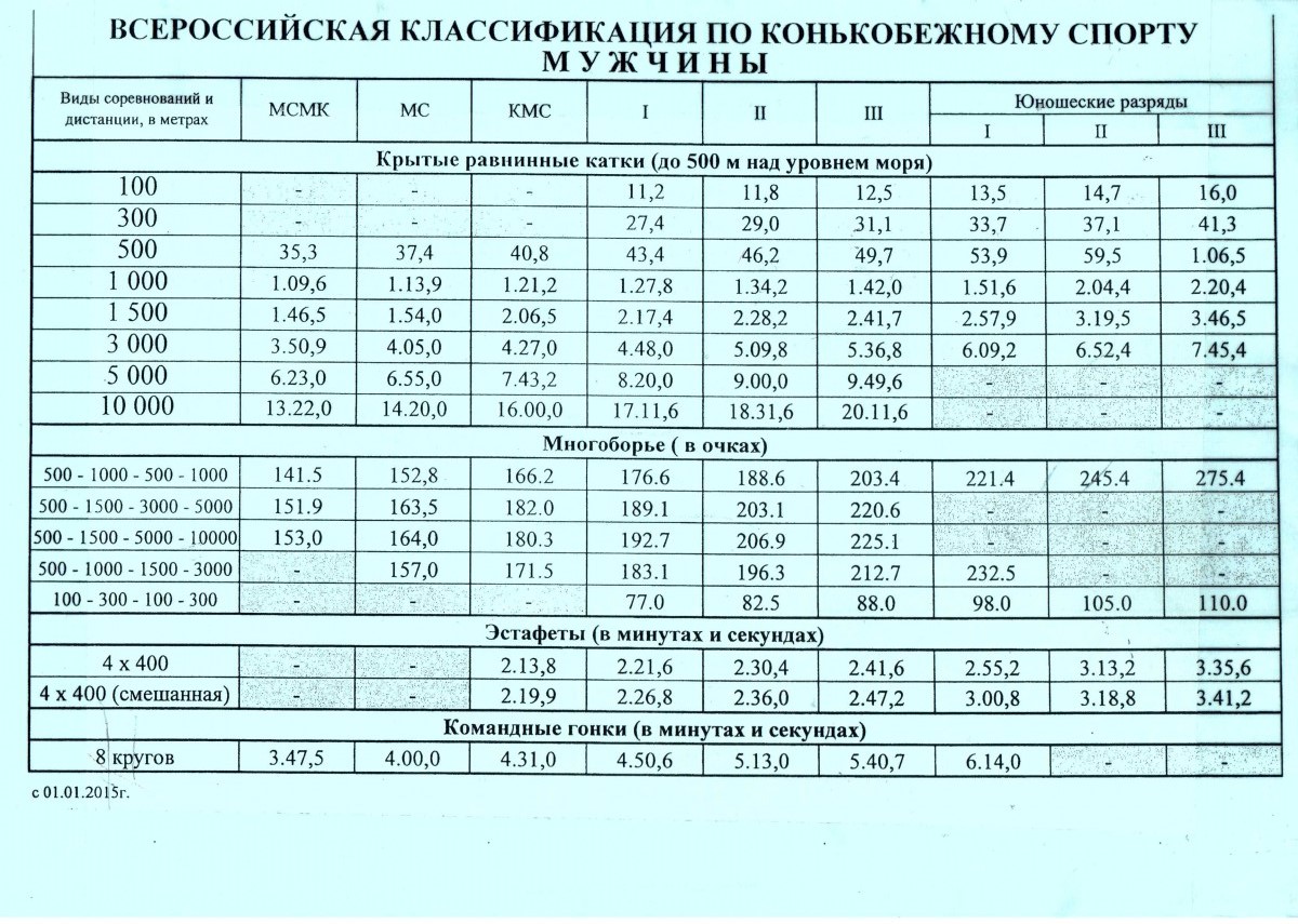 Классификация присвоения разрядов по конькобежному спорту мужчины