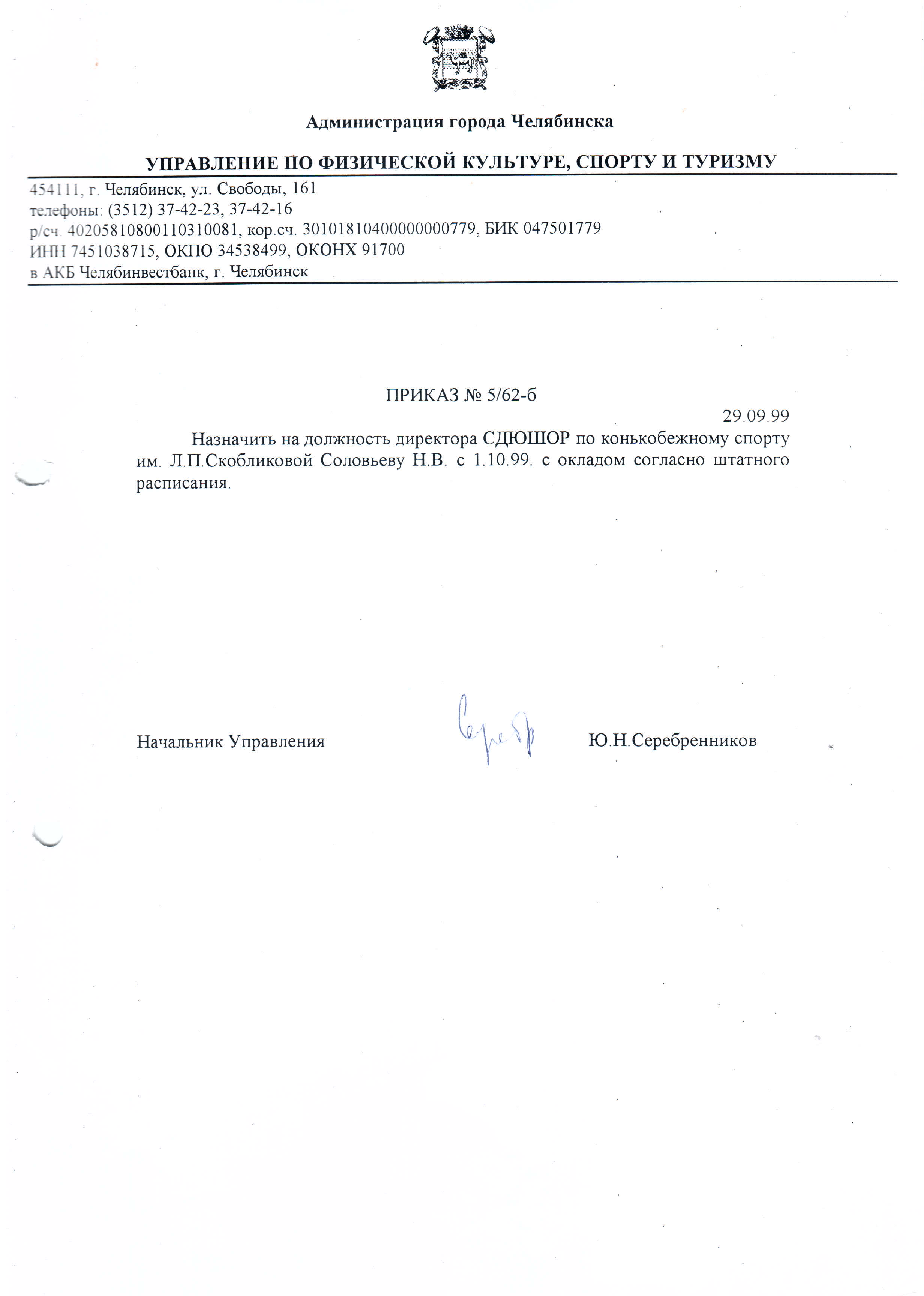 Приказ о назначении руководителя учреждения
